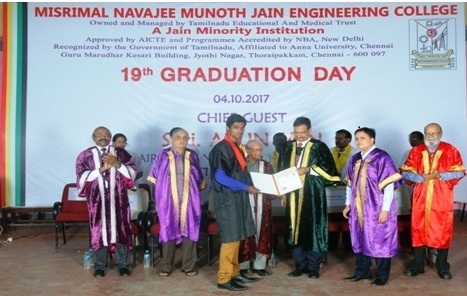 This was occasion of 19th Graduation day of Misrimal Navajee Munoth Jain Engineering College (MNM Jain Engineering College) which was held recently in the college premises. The Chairman M. Lalchand Munoth initiated the function. Dr. C. Chandrasekar Christopher, Principal, Misrimal Navajee Munoth Jain Engineering College welcomed the gathering and delivered the college report. Dr. Harish L Mehta, Secretary: Administration, L. Jaswant Munoth Secretary: Academic and members of the Tamil Nadu Educational and Medical Trust were also present.