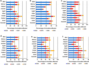 The study estimated that smaller islands Chetlat and Amini are expected to have major land-loss. Projection mapping indicated that about 60%-70% of existing shoreline would experience land-loss in Amini and about 70%-80% in Chetlat. The present work highlights that, larger islands Minicoy and the capital Kavaratti are also vulnerable to sea-level rise, and expected to experience land-loss along 60% of the existing shoreline. Sea-level rise effects are seen to have the least impact on Androth Island under all emission scenarios.