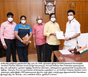 On the behalf of the Railway Employees, the General Secretary of Southern Railway Mazdoor Union, Dr. N. Kanniah, Phd., also the President of All Indian Railwaymen Federation and also the Joint Secretary of JCM (comprising 45 Lakhs Central Government employees) Staff Side, which is headed by the Union of Indian Cabinet Secretary, in which all the Principle Secretaries of the Departments are members handed over Cheques, for a sum of Rupees One Crore Seventy Lakhs to the Honorable Chief Minister of Tamil Nadu Shri. M.K. Stalin. Along with him, the President of SRMU and All India President of HMS Shri. C.A. Raja Sridhar and son of Shri. Dr. N.K. Kanniah, Shri. K. Prakash, Managing Director, Balaji Group of Companies and his daughter Dr. Kannan Prema, Sr. Plastic Surgeon, Apollo Hospital were there. Also Dr. Kannan Prema, in her personal capacity gave a cheque for Rupyees One Lakh to the Honorable Chief Minister of Tamil Nadu Shri. M.K.Stalin.