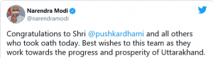 In a tweet, the Prime Minister said, “Congratulations to Shri @pushkardhami and all others who took oath today. Best wishes to this team as they work towards the progress and prosperity of Uttarakhand.”