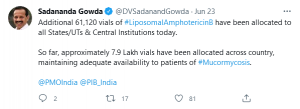 Union Minister for Chemicals and Fertilizers, Shri D.V Sadananda Gowda announced that an additional 61,120 vials of Liposomal Amphotericin-B, used in the treatment for Mucormycosis have been allocated to all States/UTs and Central Institutions today.