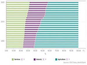The largest portion of the formal workforce is engaged in the agricultural sector, 42.4% in 2019. The industry and the services sectors have both seen an increase in their share of total employment, reaching 25.6% and 32% in 2019 from 15.3% and 23.0%, respectively, in 1996.